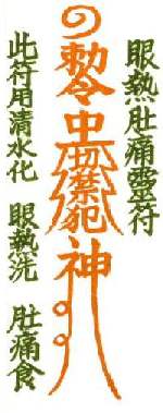 3.6 This charm is good for eye ailments and abdominal pains. Burn it and put the ashes in a glass of cold water. For the eyes, use the water to `bathe' the eyes. For abdominal pains, drink the water:-